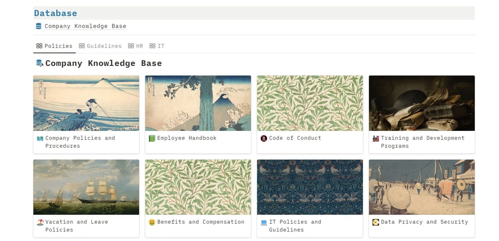 The Notion Knowledge Base Template includes a Dashboard that provides a visual overview of your knowledge base. Group and categorize documents based on their assigned tags, making it effortless to find relevant information. Customize and create new views to align with your company's structure and enhance your browsing experience.